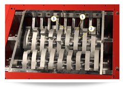 ① 動(dòng)刀:剪切物料 ② 隔套:控制動(dòng)刀間隙 ③ 定刀:防止物料纏繞刀軸